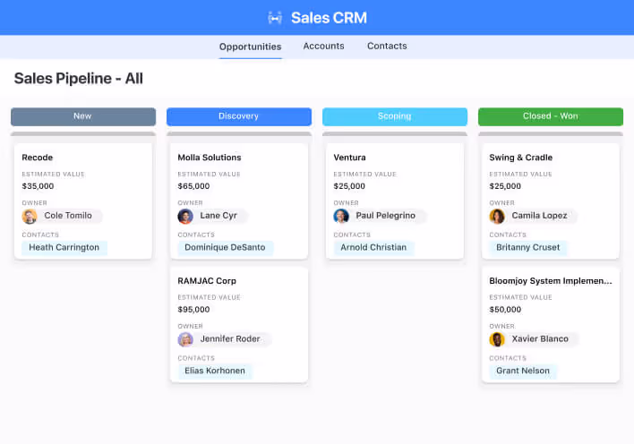Boost your sales performance and win new business with ease. Manage opportunities, tasks, accounts and contacts while keeping a clear, real-time view of your entire sales pipeline.